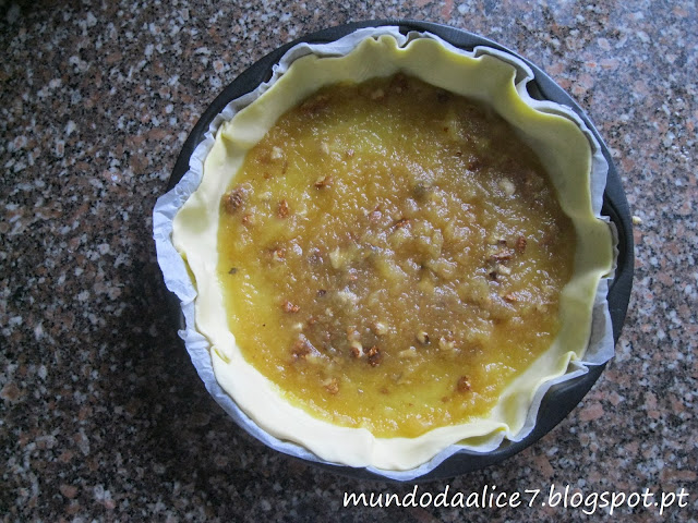 Descascam-se 4 maças, cortam-se em pedaços e metem-se num tacho ao lume com a àgua, o açúcar a raspa de limão e polvilha-se com canela. Enquanto este preparado está ao lume, estende se a massa folhada na forma. Quando a maça já estiver cozida tritura-se com a varinha, mistura-se as nozes, e verte-se o preparado para cima da massa folhada. De seguida cortam se as restantes maças aos gomos e metem-se por cima da tarte. Derrete-se a manteiga e com esta pincela-se a tarte. Por fim é só polvilhar a tarte com canela e leva-se ao forno a 180º durante 50 minutos.